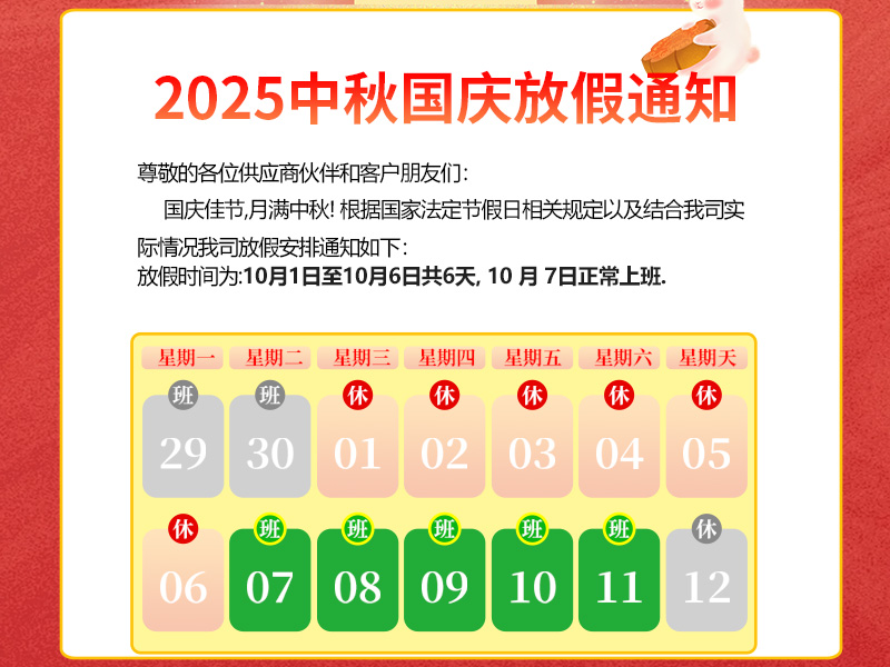尊敬的各位供應(yīng)商伙伴和客戶朋友們:國慶佳節(jié),月滿中秋!國慶家園月圓人團(tuán)園,國慶中秋雙節(jié)共歡騰!在此預(yù)祝大家度過一個輕松、愉快的假期.根據(jù)國家法定節(jié)假日相關(guān)規(guī)定,再結(jié)合我司實(shí)際情況,現(xiàn)將2025年國慶中秋節(jié)放假安排通知如下:放假時間定為10月1日至10月6日(星期三至星期一),共計(jì)6天.2025年 10月 7日(星期二)正式上班,假日期間如有業(yè)務(wù)需求可電話咨詢業(yè)務(wù),感謝大家的理解與配合!秋高氣爽迎中